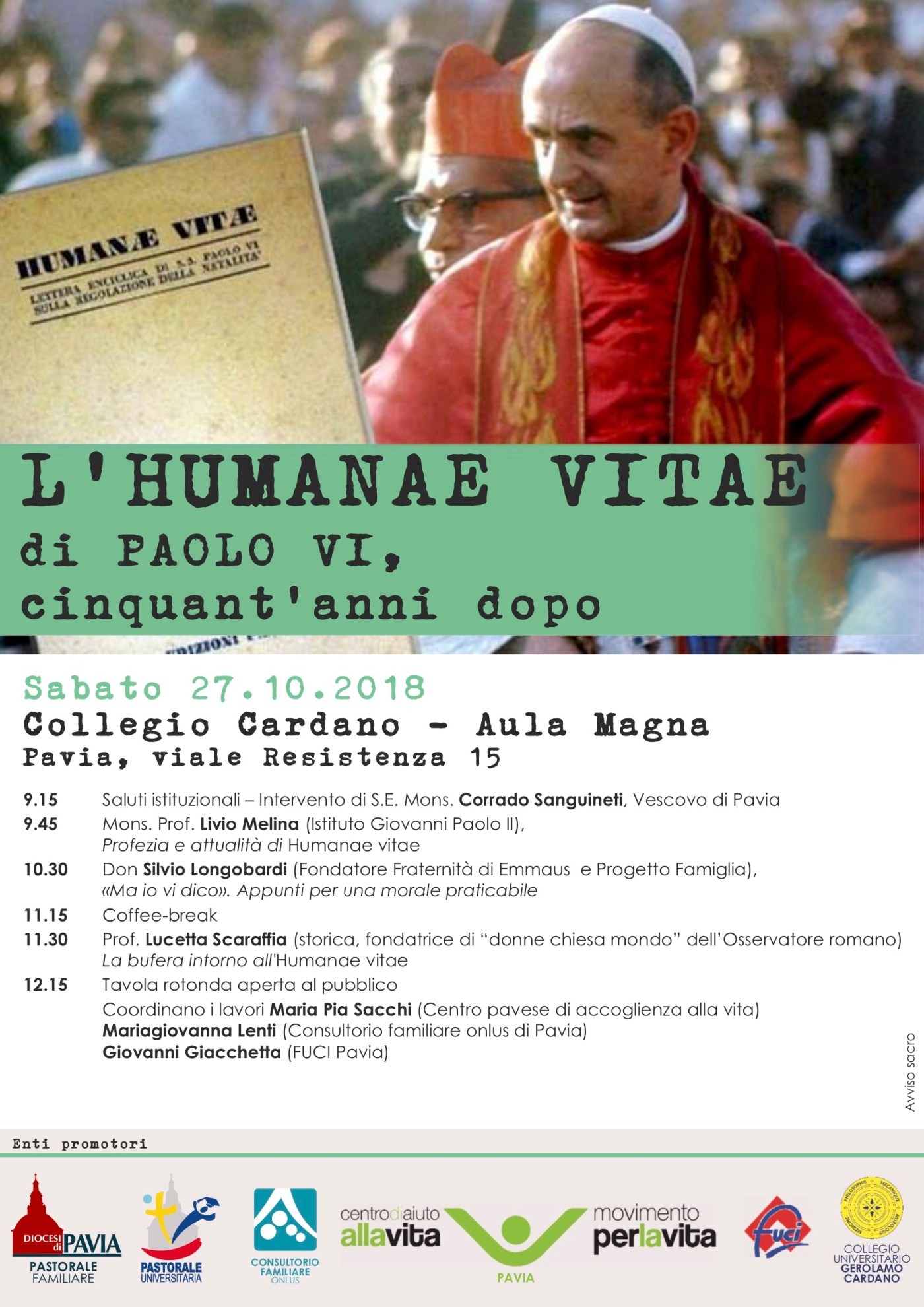Sabato 27 ottobre dalle ore 9 al Collegio Cardano si terrà il convegno nell’occasione dei 50 anni dell’enciclica di San Paolo VI. Qui di seguito la locandina.