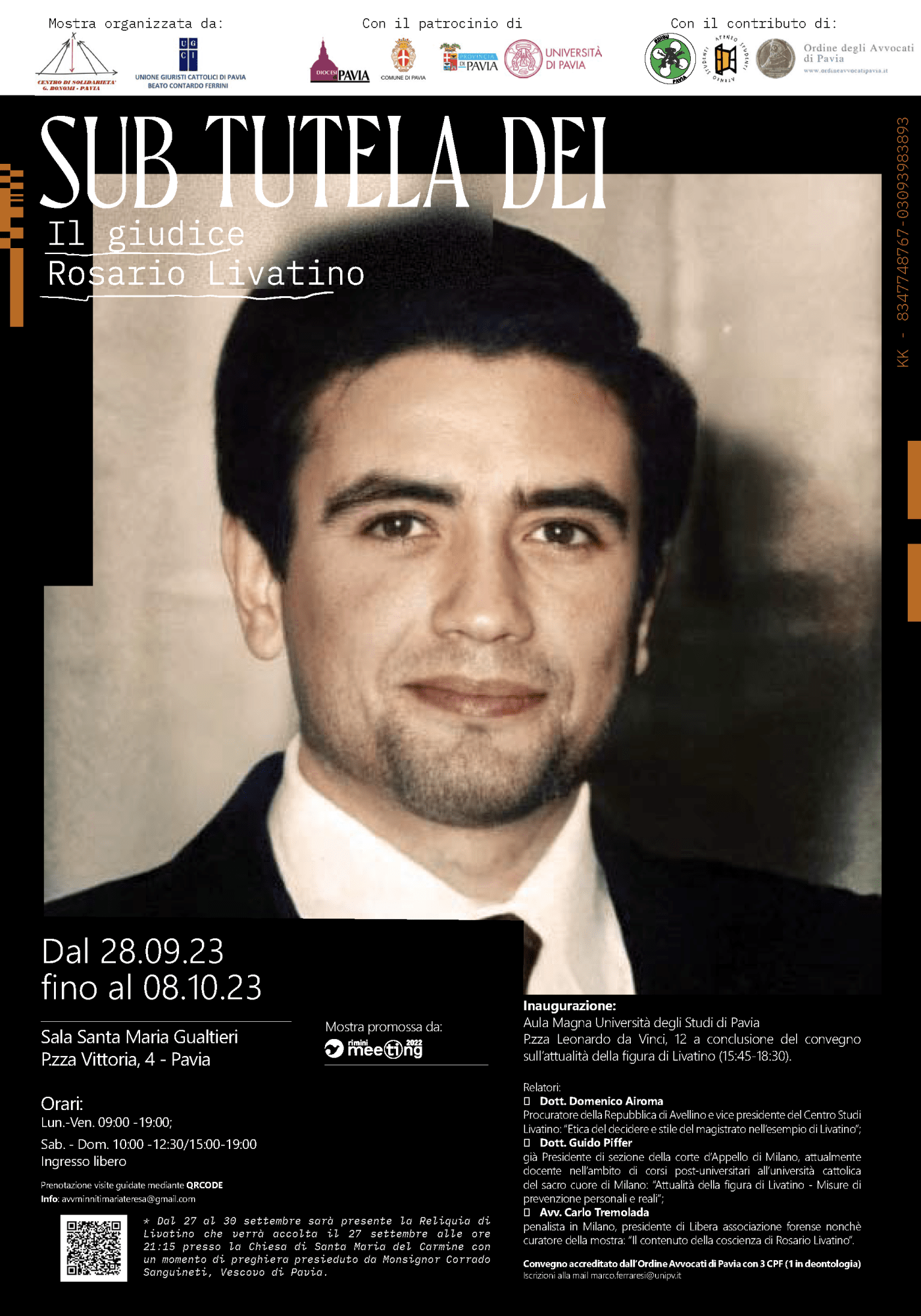 Presso la Sala “Santa Maria Gualtieri” (P.zza Vittoria n. 4) dal 28 settembre all’8 ottobre 2023 a Pavia si terrà l’esposizione ad ingresso libero della Mostra “SUB TUTELA DEI” sulla figura del giudice siciliano Rosario Livatino, patrocinata anche dalla Diocesi di Pavia.