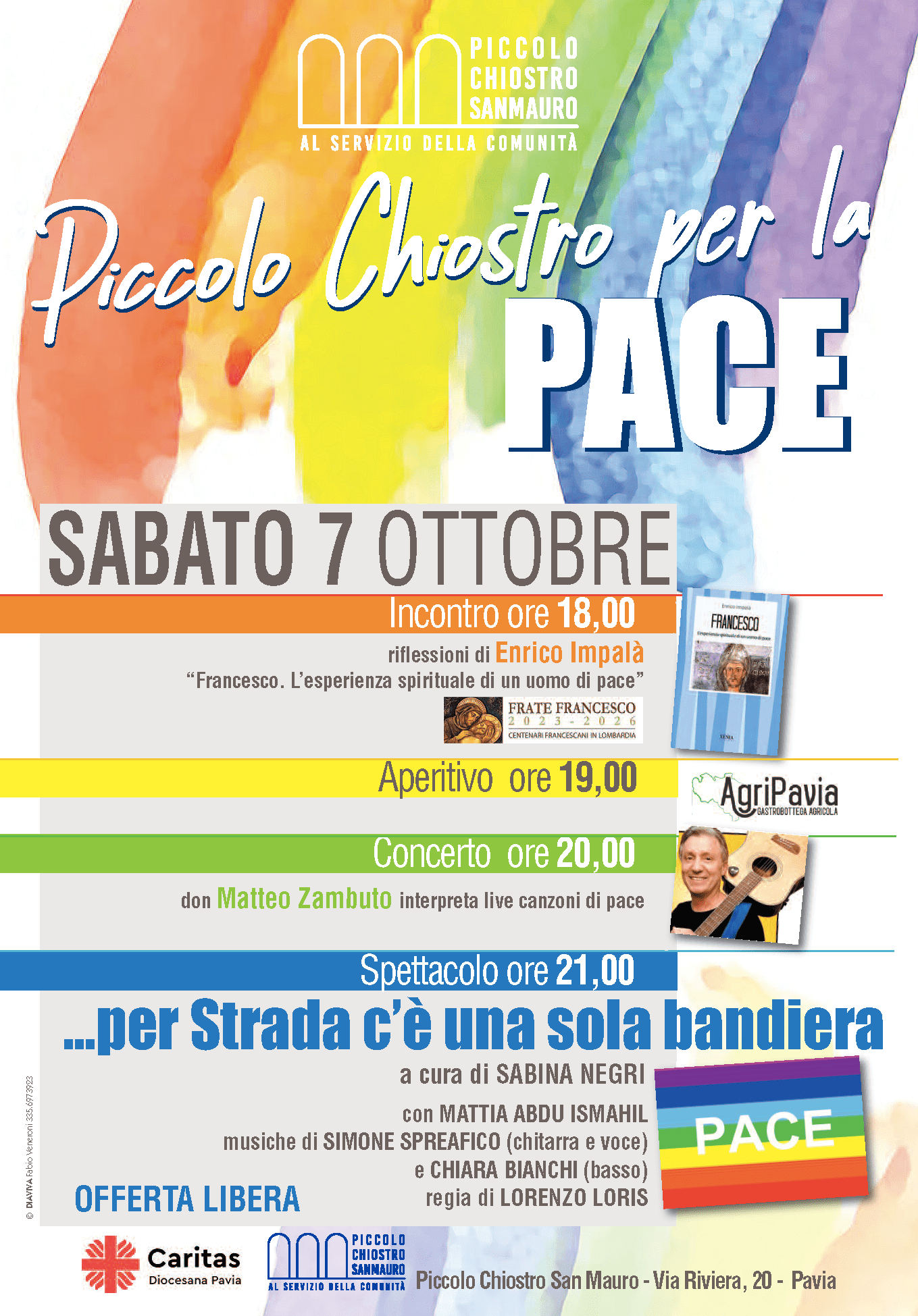 Si segnala un’iniziativa del Piccolo Chiostro San Mauro sul tema della pace che si terrà nella giornata di sabato 7 ottobre 2023, a partire dalle ore 18.00. L’evento vedrà coinvolti i colleghi Enrico Impalà, protagonista di un angolo di riflessione sulla figura di S.Francesco ed il suo rapporto spirituale con il valore universale della pace e don Matteo Zambuto, con le sue interpretazioni canore nel concerto serale delle ore 20.00.