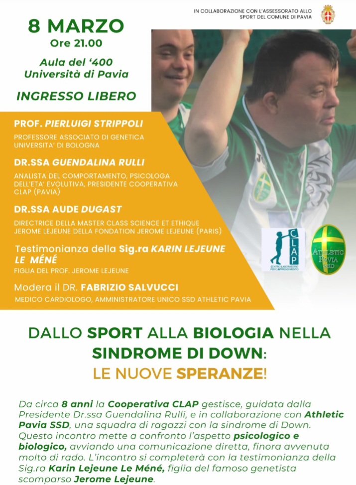 La Cooperativa CLAP gestisce, guidata dalla Presidente Dr.ssa Guendalina Rulli, e in collaborazione con Athletic Pavia SSD, una squadra di ragazzi con la sindrome di Down. Questo incontro mette a confronto l’aspetto psicologico e biologico, avviando una comunicazione diretta, finora avvenuta molto di rado. L’incontro si completerà con la testimonianza della Sig.ra Karin Lejeune Le Méné, figlia del famoso genetista scomparso Jerome Lejeune, scopritore della causa della sindrome di Down e proclamato Venerabile dalla Chiesa cattolica.