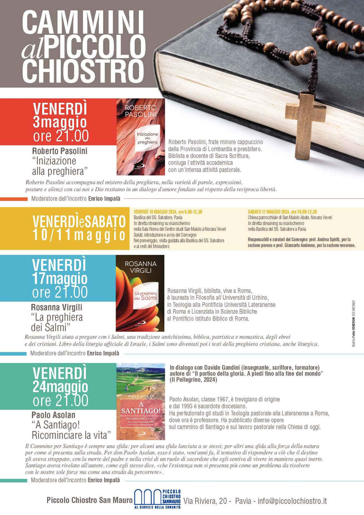 Si segnala la serie di incontri a cura dell’Associazione Piccolo Chiostro San Mauro sul tema della preghiera che si terranno nel prossimo mese di maggio. L’iniziativa vedrà coinvolto il collega Enrico Impalà, come moderatore degli incontri che vedranno tra i protagonisti Roberto Pasolini, Rosanna Virgili e don Paolo Asolan.