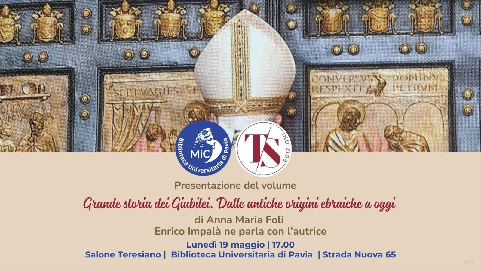 Lunedì 19 maggio prossimo, alle h. 17.00, presso il Salone Teresiano della Biblioteca universitaria di Pavia ci sarà la presentazione del volume “Grande storia dei Giubilei. Dalle antiche origini ebraiche a oggi” di Anna Maria Foli, studiosa di religioni e storia della Chiesa, che sulla base di nuove scoperte e documenti racconta nella propria ricostruzione storica questa tradizione millenaria, per certi versi ambigua, fatta di trionfalismi, interessi economici, lacerazioni e religiosità popolare.