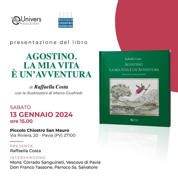 Sabato 13 gennaio alle ore 15 ci sarà la presentazione del libro “Agostino. La mia vita è un’avventura” scritto dalla giornalista pavese Raffaella Costa, con illustrazioni di Marco Giusfredi. La stessa autrice sarà presente per introdurre il suo lavoro. A seguire, interverranno Mons. Corrado Sanguineti, Vescovo di Pavia, e Don Franco Tassone, che offriranno preziosi... Continua a leggere →