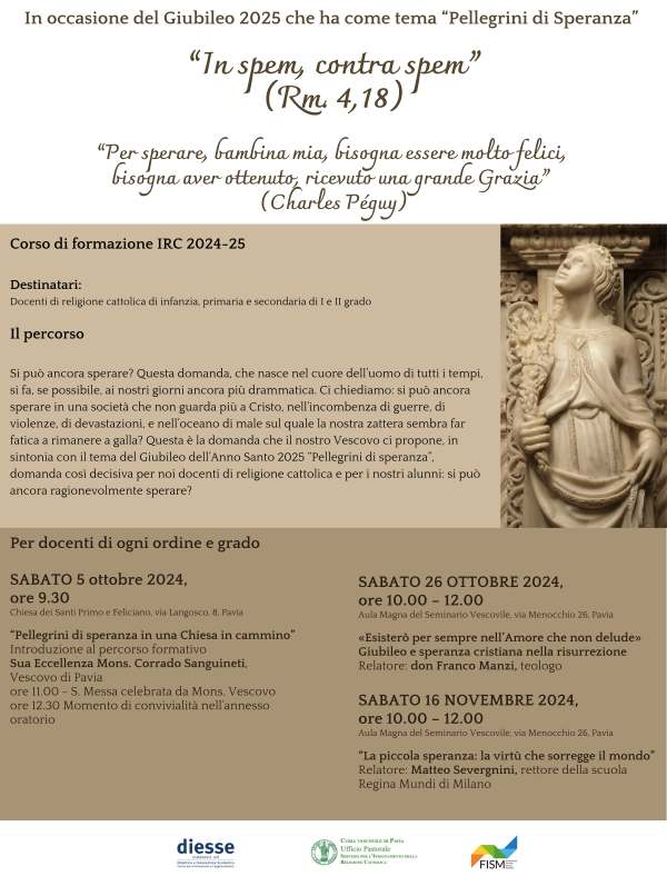 "In spem, contra spem" (Rm 4,18) Corso di formazione per i docenti di religione cattolica - Scuola dell'Infanzia, Scuola Primaria e Scuola Secondaria di I e II grado Il percorso Si può ancora sperare? Questa domanda, che nasce nel cuore dell’uomo di tutti i tempi, si fa, se possibile, ai nostri giorni ancora più drammatica.... Continua a leggere →